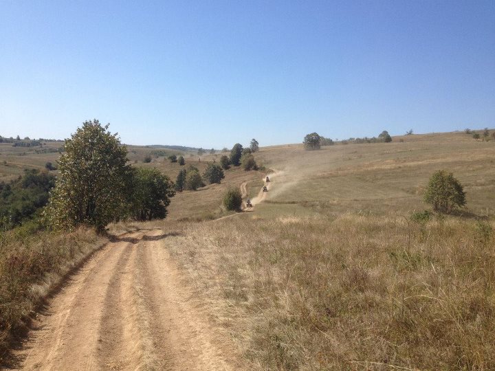 Jako mávnutím proutku tedy couváme zhruba kilometr, který jsme před chvílí vystoupali. Dole zastavujeme totálně obalení bahnem ale s úsměvy od ucha k uchu.. tohle byl Vážení fakt masakr. Rumun v Harvestoru nás zdraví a hlásí, že nahoru to nemá smysl, že cesta končí pár metrů nad místem, kde jsme skončili. Nezbývá nám tedy než sklouznout údolím k dunaji. To nám ale tolik nevadí protože je již pozdní odpoledne a jsme řádně vyštavení z dnešního totálně terréního dne. Při klesání k dunaji potkávám cestu, která směřuje k sousednímu údolí blíže Rovensku a tak se na ní vydávám. Brzy ale zjišťuji, že nejsme všichni. Obracím a pár set metrů zpět nacházím mladého bimbajse, který mně bezeslova ukazuje praský zadní kříž jeho Polarisu. Bohužel všem je jasné, že dojezdil a tak ho táta zapřahuje na lano a společně míříme směr Rovensko. V Rovensku na návsi potkáváme partu pražských motorkářů, které postupně zdravíme a oni nám postupně neodpovídají, asi jinej gang. Po krátké pauze pokračujeme směr Gernik s tím, že na rozbité polárce jede Bimbajs senior. Cesta jde vcelku OK akorát Bimbajs nadává, že jezdit na polárce jen na předek je totální záběr na ruce. Po pár kilometrech sjíždíme do vrchní části údolí Sichevity, kde zastavujeme a čekáme na posledního jedoucího Páju. Ten doráží a už z dálky nám ukazuje pěkně krvavý loket. Kd