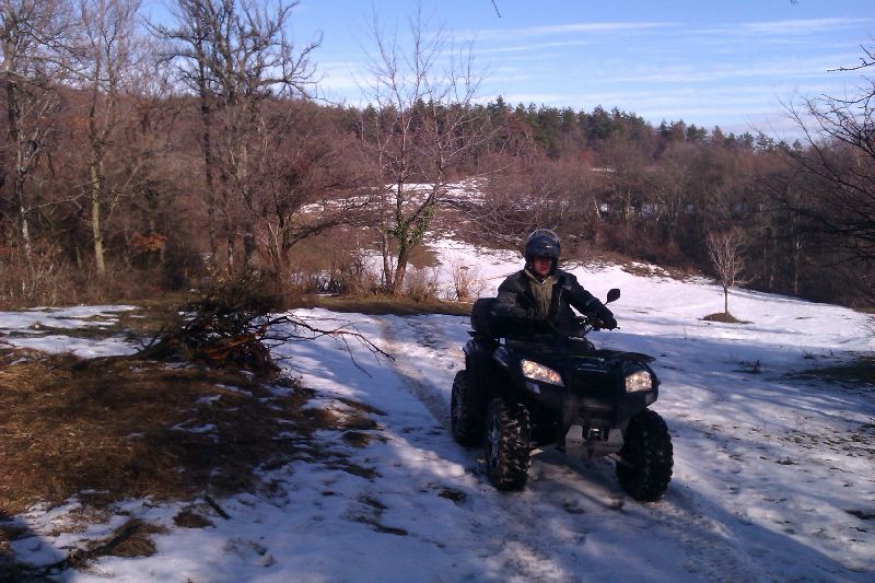 Cesta obcí je relativně v pohodě ale za vesnicí nastává skutečné peklo protože je tam sněhu víc a navíc před námi nikdo nejel. Jsem rád, že mám za zády místního a taky za to, že před námi projel majitel penzionu na sněžném skůtrů tudíž sleduji jeho stopu. Jumbo podává fantastický výkon a tak sice hrabe jak o život ale přesto se pomalu posouváme k vrcholu. Za zlomem hřebenu začíná cesta klesat a po pár zatáčkách přijíždíme k několika traktorům, které se pokouší vyprostit zapadlý pluh. Rumuni nám ochotně udělají místo k průjezdu a my jedeme dál. Cesta z kopce pak probíhá v pohodě jen občas míjíme odstavené auto, které se nevydrápalo. Okolí je zasněžené jak v pohádce ale není moc čas se kochat. V Moldově jde Vašek koupit řetězy a já na něj čekám před servisem. Během čekání se na čtyřkolku chodí postupně podívat všichni automechanici a jejich pochvalně zdvižené palce svědčí o tom, že se jim stroj skutečně líbí. S řetězi pak míříme zpět do Gerniku. Cesta nahoru je již o poznání lepší jelikož jedu ve svých kolejích a tak se jede docela v pohodě. U Merhautů pak předávám řetězy a totálně zmrzlý se jdu naobědvat. Pája s Vaškem a sousedem pak přidělávají řetězy přičemž je musí celé předělat protože jsou o kousek větší.