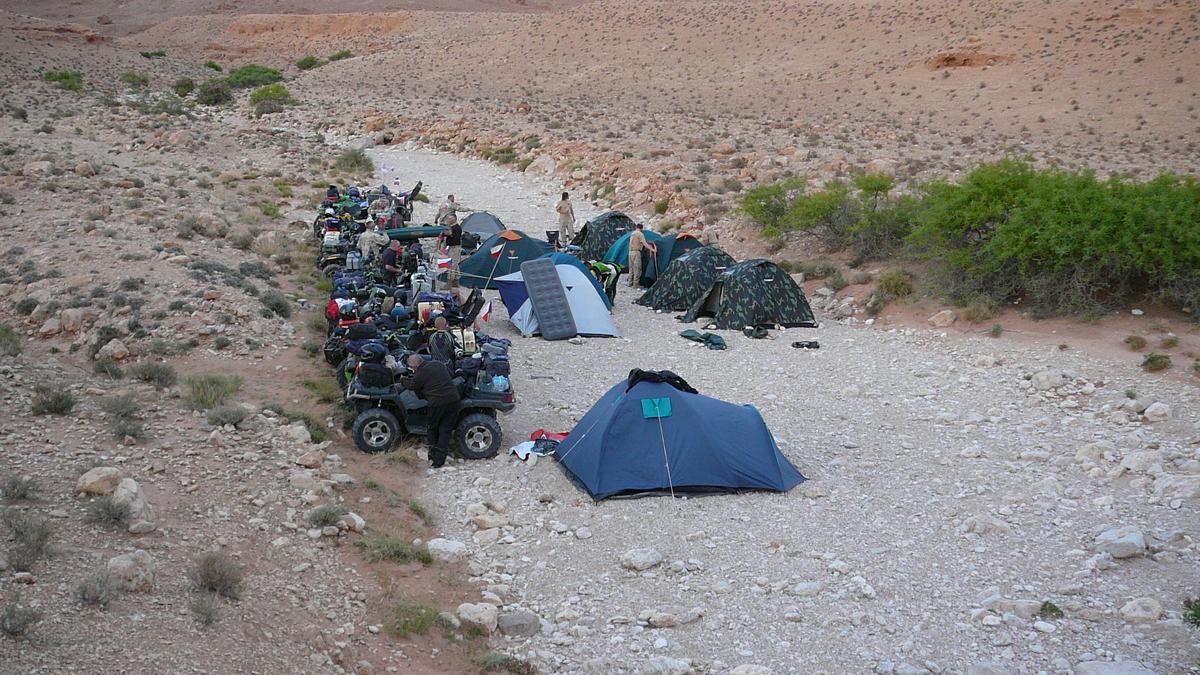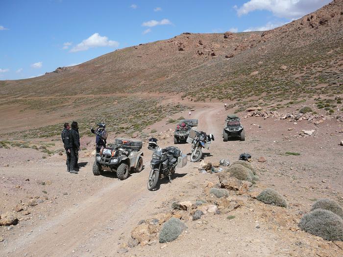 Hory to byly pěkné, třítisícové a jmenovaly se Atlas. V noci sice zima, ráno čtyřkolky zamrzlé jinovatkou, jinak ale přes den okolo 20 stupňů, takže hodně příjemně. Do výšky tři tisíce metrů jsme jeli ve skupinkách po dvou, po třech, abychom si vzájemně neprášili. Riziko ztracení bylo prakticky nulové, protože každý měl buď mapu nebo GPS, a kdo neměl ani to ani ono, držel se někoho, kdo jí měl. Místy jsme projížděli sněhovými poli, křižovali jsme vádí, vyprahlá koryta vyschlých řek, jednou jsme přenocovali u překrásného jezera Imil Chel v berberském stanu. Noc v něm byla příjemná, jen jsme museli hlídat čtyřkolky. Ne že by je někdo chtěl ukrást, ale místní dětičky, budoucnost naší země, andílkové zlatí, by možná mohly některé nepřišroubované věci odnést a zužitkovat po svém. A tak jsme se pro všechny případy střídali v hlídání po hodině. V horách nás překvapilo, jak rychle tu teď vznikají nové cesty. Buldozery se zakusují do kamení, a kudy posledně nemohl prolézt ani kamzík, tam je dneska štěrková nebo šotolinová cesta. Taky tu dostali dobrý nápad, jak ušetřit asfalt při tamním malém provozu – vyasfaltovaný je jen jeden pruh, vlevo a vpravo kolem je široká štěrková krajnice na vyhýbání. Auta se vyhýbají po krajnicích, a pak si zase jede každé dál po asfaltu.