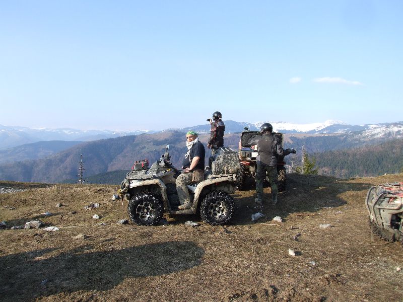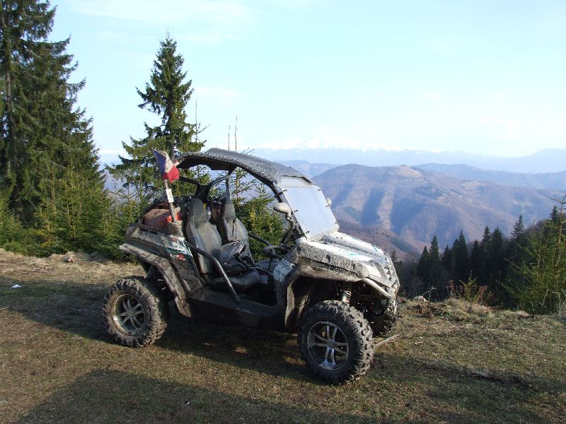 Chvíli se kocháme a vyměňujeme si zážitky z adrenalinového výjezdu a pak už sedáme na stroje a pokračujeme parádní hřebenovou cestou směrem na Vf Intre Maguri (1222) a dál na Vf Piatra Arsitei (1225). Na hřebenech projíždíme jak opuštěné, tak obydlené salaše. Místy je cesta úzká tak akorát pro čtyřkolku a po obou stranách padají do údolí holé stráně. Skutečná krása. Z hřebene sjíždíme neméně pěknou vrstevnicovou cestou níže, abychom zase vyjeli na pastviny se salašemi a tak pořád dokola. Po průjezdu jednou ze salaší cesta končí a kluci vpředu jen po stopách dřevařského auta nachází svozovou cestu kamsi do údolí. Dál nastává hardcore sjezd totálně vymletou těžařskou spádovkou. V duchu si říkám dej bože, ať do dole někam pokračuje a my to nemusíme stoupat zpátky :D. Kluci zastavují a potvrzují, že se jim v hlavách honí totéž :D. Hlavně ne tudy nahoru a tak než řeknu švec Keeper odkudsi vyloví kapesní pilku a Pája taktéž a vrhnou se na povalený strom až piliny lítají, hotoví bobříci. Netrvá to ani 10 minut a cesta je volná. Ještě odklidíme větve a pak už pokračujeme v krkolomném sjezdu do údolí.