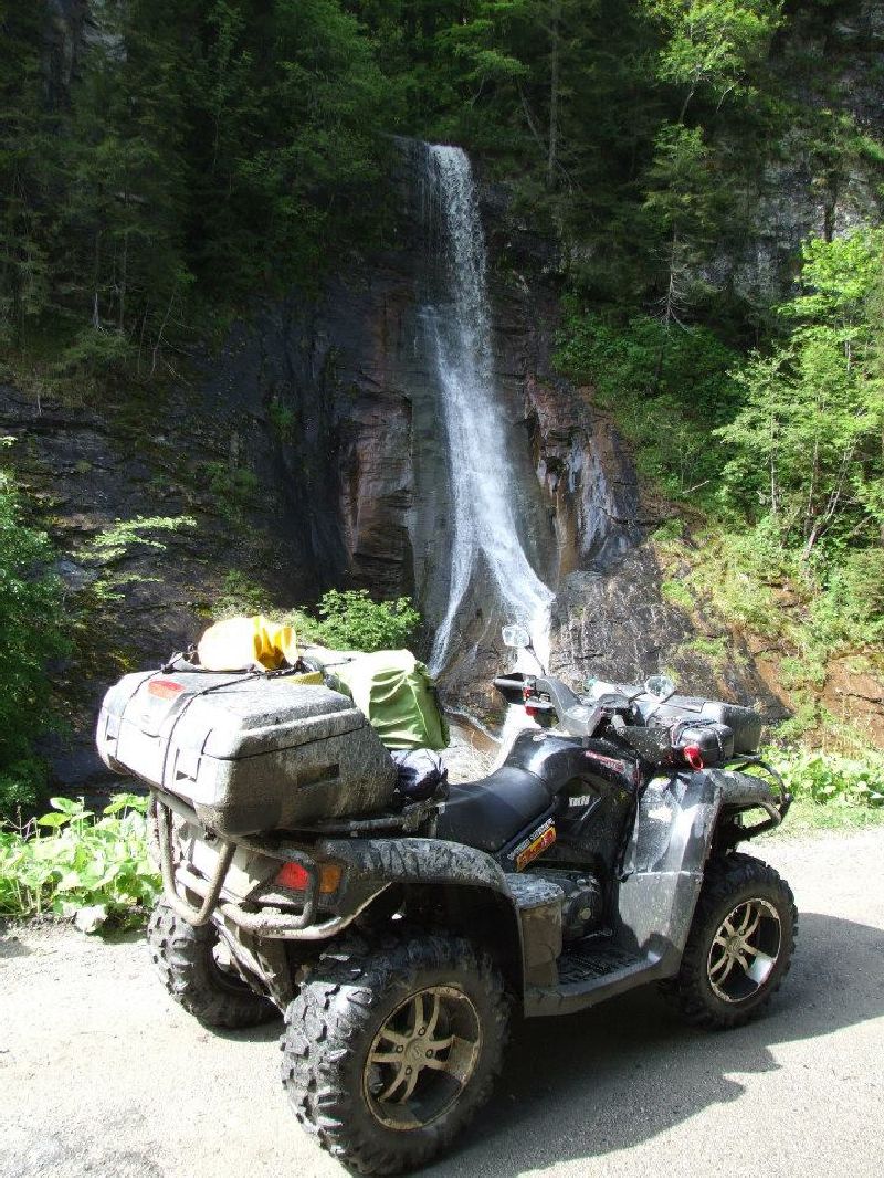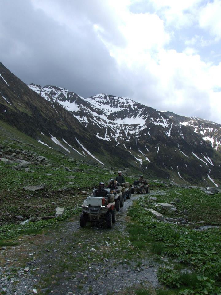 Za horským střediskem se tedy vydáváme po Transalpině směr průsmyk Urdele. Silnice je uzavřená takže objíždíme betonový zátaras a stoupáme do mraků. Důvod uzavření silnice je brzy jasný, narážíme na vysoké sněhové závěje ale i laviny kamení, které přehrazují cestu. Vrcholy hřebenů jsou k našemu velkému zklamání zahaleny hustými mraky a leje jako z konve. Vystoupáme pár metrů pod nejvyšší bod cesty zhruba do 2100 metrů a narážíme na místo které na čtyřkolce nezdoláme. Sem se tedy musíme vrátit za lepšího počasí. Pořídíme společné foto a pak otáčíme a sjíždíme k otevřené smíšence (Magazine Mixt), kde si dáváme horký čaj a pod slunečníky zkoušíme bouřku přečkat. Po chvilce moknutí přijíždí parta kluků na motorkách a překvapivě mluví česky. Říkají že sedlo přejeli respektive převedli a že my to opravdu nedáme. Naše stopy jim prý udělali radost protože to pro ně znamenalo že sedlo zdolají a naše strana je sjízdná i pro čtyřkolku :D. Chvilku s nimi pokecáme dáme oběd a pak se rozhodujeme k úprku (bouřka se točí na vrcholech a nevypadá to že by dnes mělo přestat) a totálně promočení sjíždíme po Transalpině dolů do Novaci.