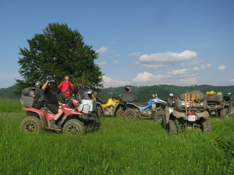 V rychlosti pozdravíme Merhautovi a dozvídáme se smutný příběh ubytovaných čtyřkolkářů (takový česko německý mix) ti dorazili včera a jeden z nich cestou usnul rozbil auto a hlavně Jumbo na vleku které je doslova napadrť. V rychlosti házíme věci na kolky a strkáme auta do dvora naší historicky oblíbené chalupy přes ulici (bezproblémový proces balení a odjezdu nám komplikuje jen „vedoucí“ oné mezinárodní výpravy, který zdřejmě nabyl dojmu, že 6 strojů tři auta a vleky jsou na příjezdové cestě málo a tak přesně v oněch 15 minutách co jsme potřebovali skládat zahájil nějaké ne zcela pochopitelné manévry s auty a vleky jejich výpravy). Nakonec se ještě krátce pohádám s polovičkou jelikož jsem doposud nepochopil ženský způsob balení věcí o rozsahu potřeb na jeden týden ani nemluvě :D a pak už vyrážíme směr Rovensko po „rozřazovací“ červené. Červená trasa plní svůj tradiční účel. Je rozmoklá kluzká a tak hledáme pořadí ve skupině, tempo, ale i osvěžujeme pravidla pro případnou pomoc atd.. Jde to samo jelikož opět narážíme na větvemi zaházenou cestu což znamená zastávku ve výjezdu a spolupráci při zprůjezdnění trasy. Jarča si zvyká na stroj ale terén zvládá výborně. Na Rovensku krátce zastavujeme nakupujeme si pár pivek a vyměňujeme si české koruny za Rumunské Lei. Dál pokračujeme směrem na Šumici. Louže které nás provázely před 14 dny jsou prázdnější přesto ale Jarča předvede parádní číslo když jednu zkouší vzít jen na dvě kola a zbylá dvě nechat na suchu :D Tahle začátečnická chyba jí vzápětí vyškolí protože je louže hlubší než to vypadalo. Když je stroj skoro na boku Jarča ladně vystupuje a boří nohu až po koleno do bláta :D Napodruhé ale louži zdolává. Testuji navigační schopnosti a snažím se kluky navést na parádní místo na spaní, které jsme na některé z předchozích výprav našli. Končím ale na řadě slepých sjezdů, které důvěrně poznávám z pátrání, které jsme zde s Pájou v minulosti opakovaně podnikli při pokusech trefit Bígr takto zvrchu. Ve výjezdech se Jarče Arctic Cat (z důvodu chladiče zalepeného při jejích bahenních lázních) mírně přehřívá a nechceme to první den moc trápit.