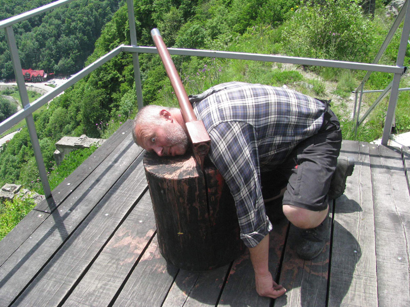 Ráno se budíme do zatažené oblohy, fouká chladný vítr a je celkově nevlídně. Naházíme tedy věci na mašiny a přes Targu Jiu po silnici sjíždíme až k Oršave. Cesta je to nepříjemná, vítr je občas tak silný, že nás i s mašinou tlačí do škarpy. Rumunští řidiči jsou pak dost bezohlední, takže nás míjí na milimetry. Občas se tu předjíždí tak nebezpečně až člověku zatrne. Uff naštěstí bez karambolu dojíždíme do Oršavy a já zjišťuji, že mi znovu zlobí kontakt u přístrojovky. Tankujeme a podél Dunaje míříme na Eibentál. Jedu první a nejednou mi Jarča v zrcátku mizí. Když se vrátím zpátky nacházím jí odstavenou na kraji silnice a kluci už cosi okukují u zadního kola. Je to nepříjemná závada, kdy na AC 700 vylezl šroub od tlumiče a po pár metrech skoro prodřel hliníkový ráfek. Šroub vracíme zpět ale ráfek to má zasebou. Chybí tak milimetr a disk se rozpůlí. Náhradní kolo nemáme a tak se rozhodujeme k další opatrné jízdě. Když dojedeme na Eibentál je pozdní odpoledne a my usedáme v hospodě u Medvěda na pár točených.